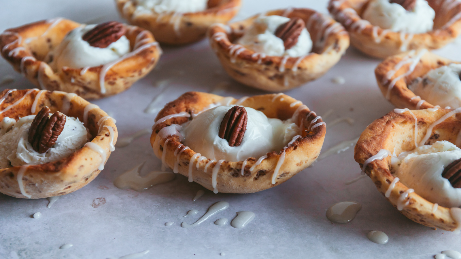 Let cool for about 10 minutes before removing. Fill with a generous scoop of ice cream, drizzle with the cinnamon roll icing, and top with a single pecan.